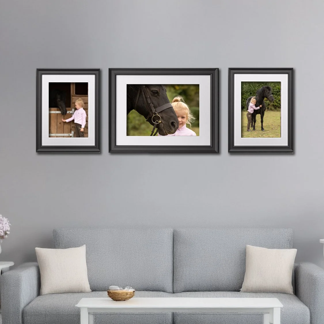 A bold and balanced collection. Perfect for showcasing a central portrait flanked by two complementary images, ideal for placing above a sofa or bed